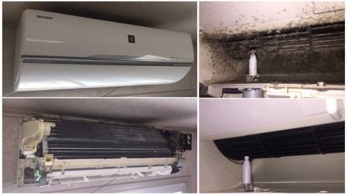 購入して6年経過したこちらのエアコン。自動お掃除機能がついていても、内部を開けるとこれだけの汚れとカビが蓄積していました。